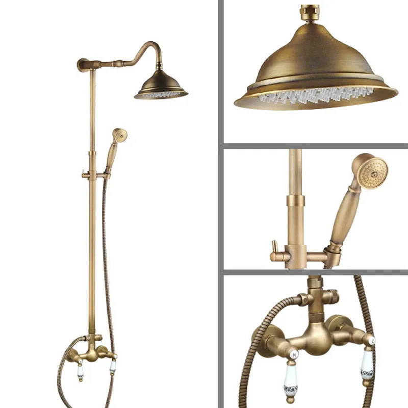 Antique Brass Wall Mounted Bathroom Rain Shower Faucet Shower Head Set Mixer Tap Dual Ceramic Handl