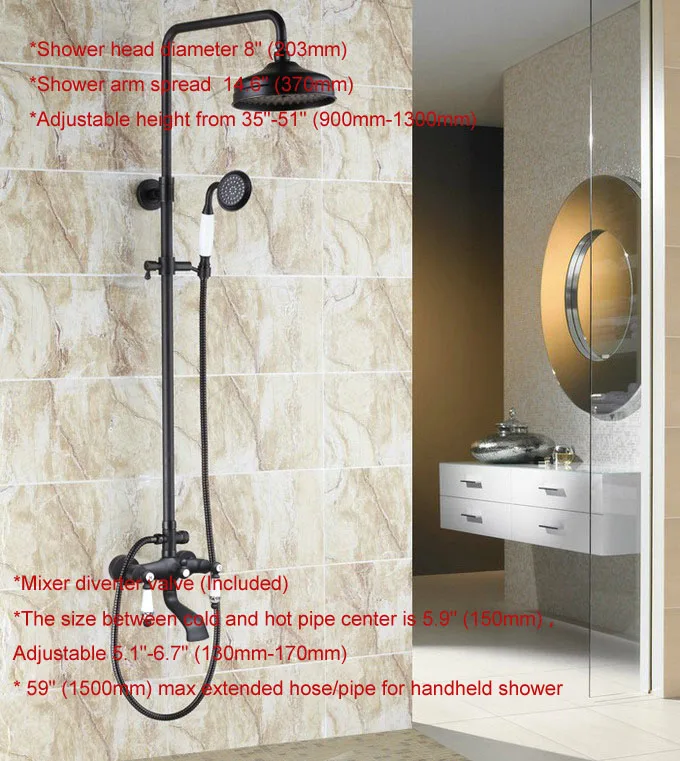 Black Oil Rubbed Brass Dual Ceramic Handles Bathroom 8 Inch Round Rain Shower Faucet Set Bath Tub M