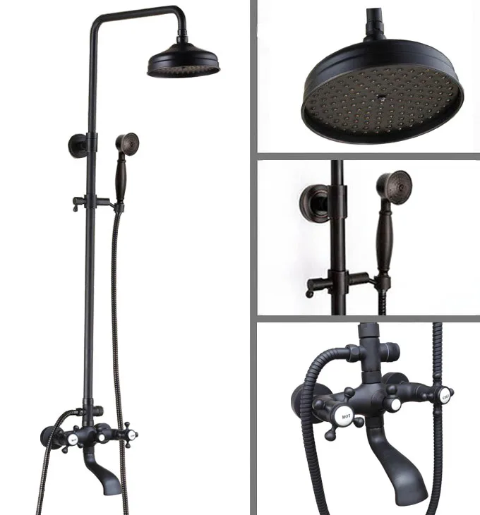 Black Oil Rubbed Brass Dual Cross Handles Bathroom 8 Inch Round Rain Shower Faucet Set Bath Tub Mix