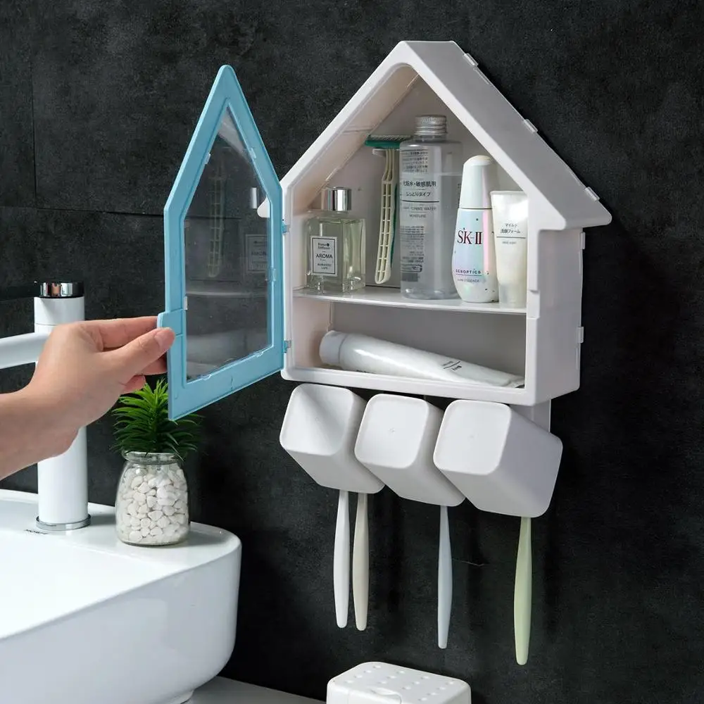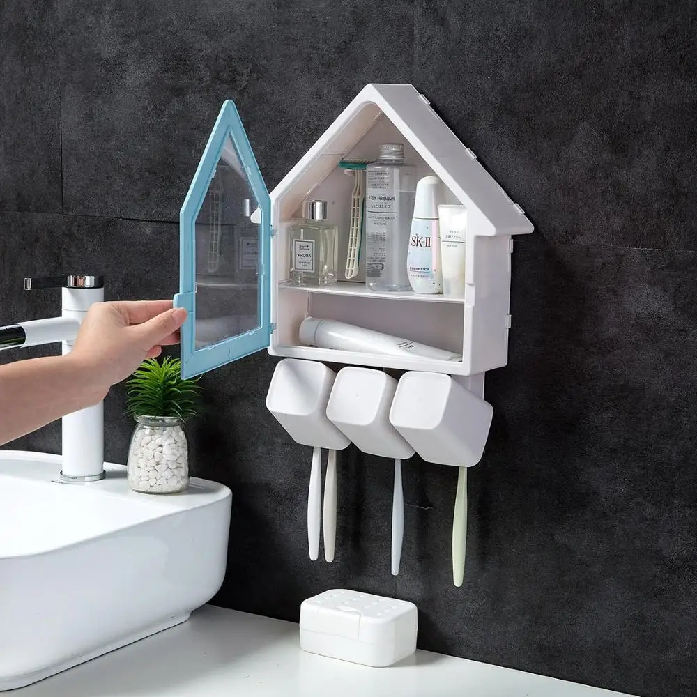 House Shape Wall Punch-free Toothbrush Holder Rack With 3 Brushing Cup Plastic Toiletries Organizer